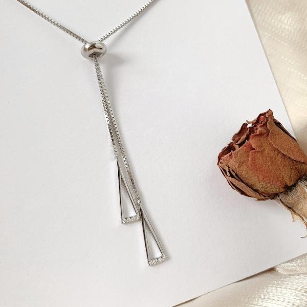 This Sterling silver triangle necklace is a stylish and versatile piece of jewelry that features a minimalist design with two triangle pendants. Made of 100% 925 sterling silver. this triangle pendant necklace is durable and suitable for sensitive skin.